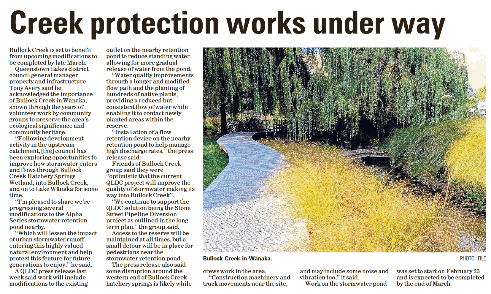 Friends of Bullock Creek (FOBC) has welcomed progress on stormwater improvements highlighted in a recent Wānaka Sun article, which outlined upcoming works to better protect Bullock Creek and the Hatchery Springs Wetland.